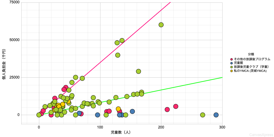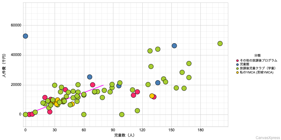 消費者物価地域差指数と利用者一人あたりの各YMCA事業項目とにおける散布図