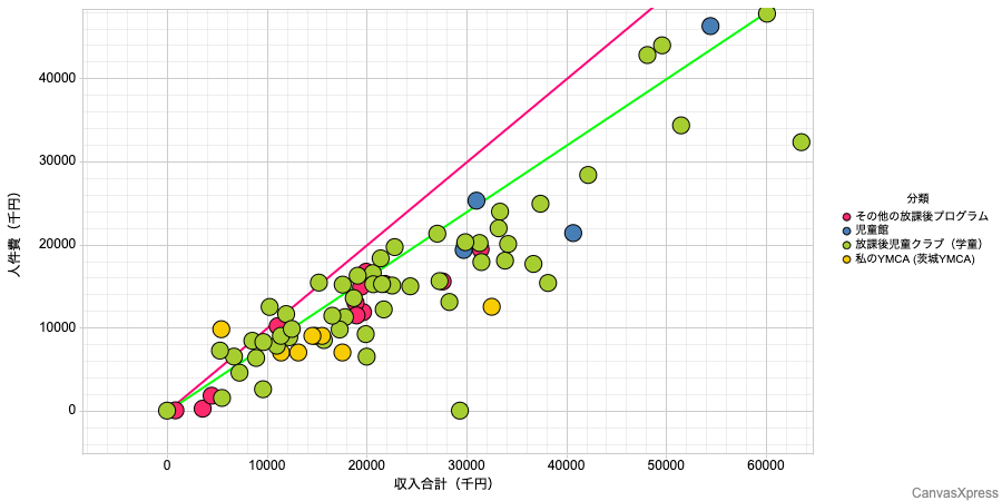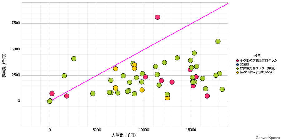 2018年と21年の、2年分のデーターを単純にプロットします。 支出差において、第1象限(右上)にプロットされたYMCAは、2年ともその項目は黒字でありますが、第3象限(左下)にいるYCMAは、2年とも赤字です。